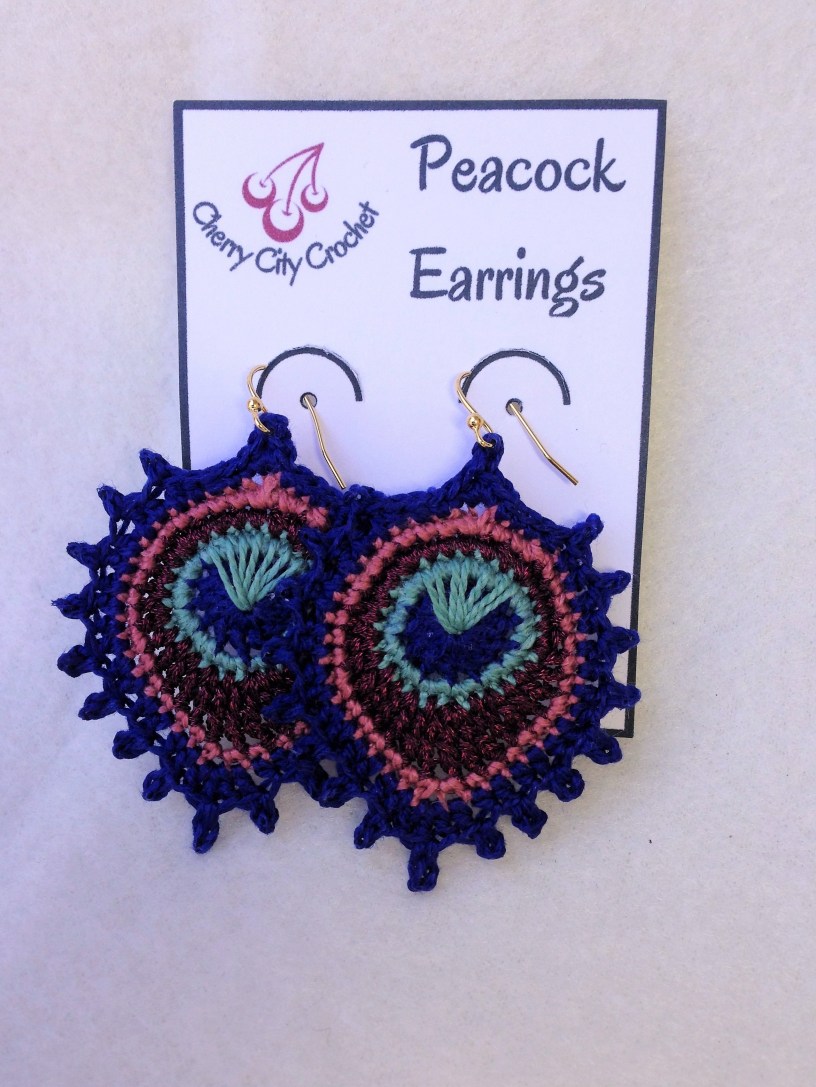 The original pattern comes from The Curio Crafts Room as a bookmark. I kept seeing it pop up on Pinterest, and I thought that the feather portion would make really lovely earrings. So, slightly modified, Peacock Earrings came into existence.